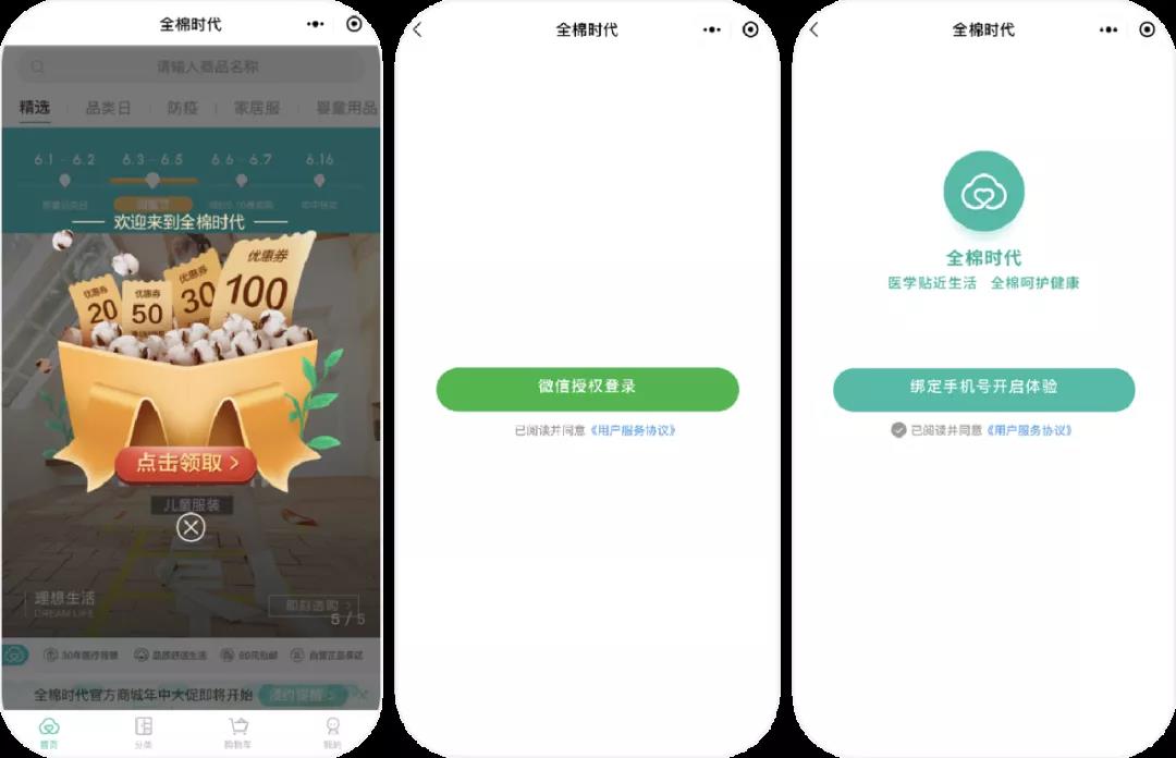 2)跳转到小程序之后,首页会有弹窗,显示优惠券,引导用户领取,小程序会提示授权获取客户的微信ID及手机号,完成授权后,自动成为全棉时代会员,后续操作如上。