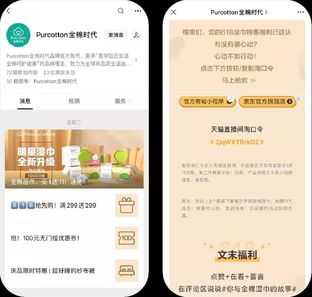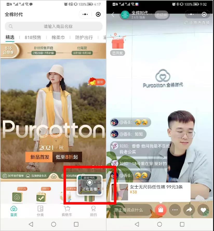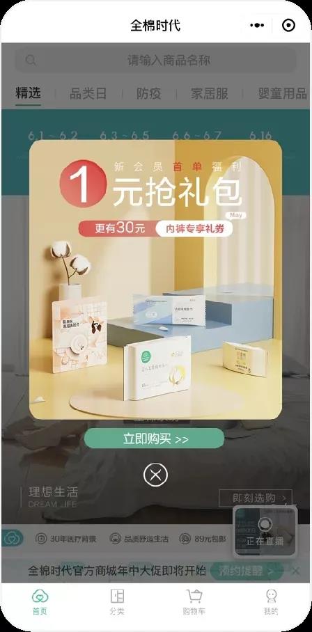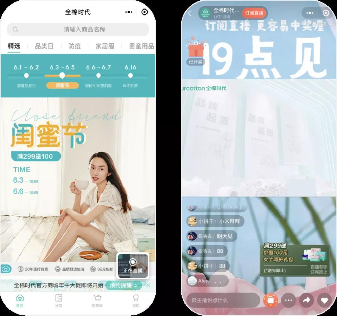 关于全棉时代的小程序商城,我们重点关注两个板块:小程序直播和社交裂变。