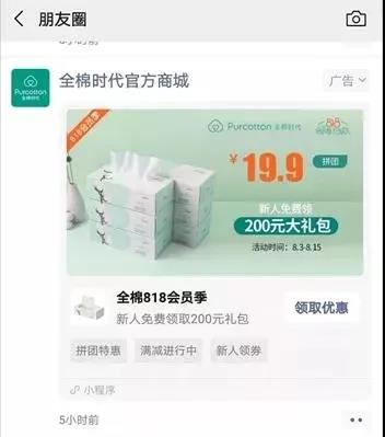 全棉时代作为目前全国唯一一家拥有医疗背景的全棉高端生活用品品牌,在4年内开90家门店,导致亏损2亿,之后开始启用企业微信作为内部管理工作,将目光集中在沉淀客户上,开始精细化私域运营,通过自身私域流量池触达客户。半年营收41.8亿,会员数量突破2000万人,小程序在2019年10月上线,不到一年内累积注册用户已达400余万。