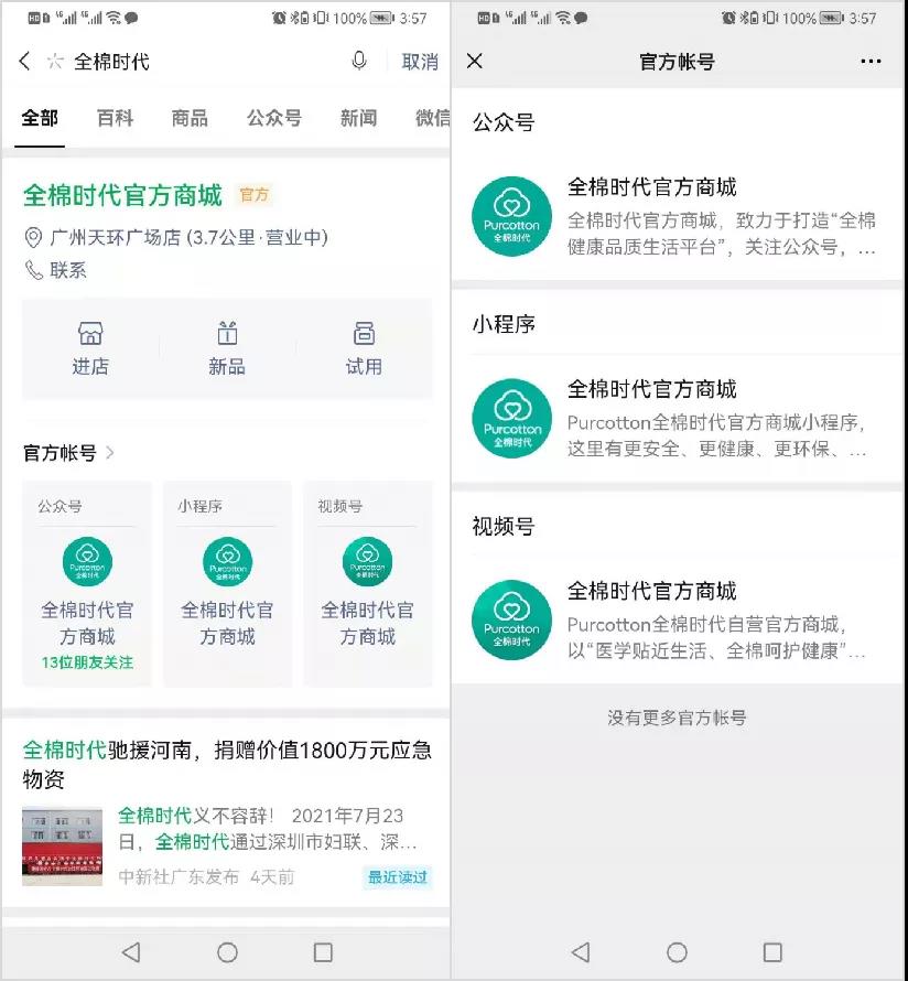 这是全棉时代在搜索渠道的「品牌专区」,它打通了公众号、小程序和视频号,通过「品牌专区」,客户可以关注公众号、访问小程序商城、打开视频号内容,还可以获悉附近门店的联系方式。