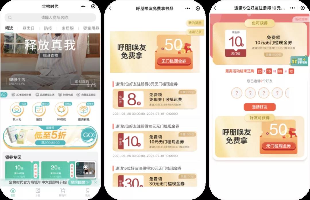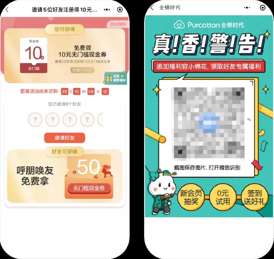 另外全棉时代还会通过红包雨、拆盲盒、邀请有礼等等助力类活动,同样利用老客户的社交关系持续裂变,给商城带来客户流量。
