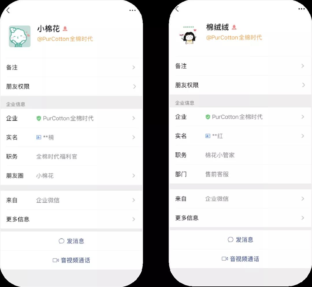 全棉时代的主要用户群体是女性,可爱的头像和昵称可以拉近与用户的距离。小棉花的企业微信对外信息展示页,放置了历史朋友圈入口,其他关于企业和品牌的信息较少,建议放上小程序入口、近期活动或官网信息,让客户在添加企业微信客服号后,可以第一时间对企业、品牌和公司产品有一定了解。