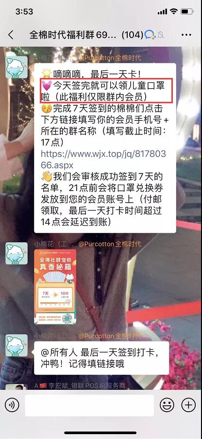 小棉花在群内发布打卡链接,以及打卡规则,引导群内用户进行签到打卡,用户签到完成后,截图发布到社群里。完成7天签到的用户即可免费领取礼品,提升用户的参与度。