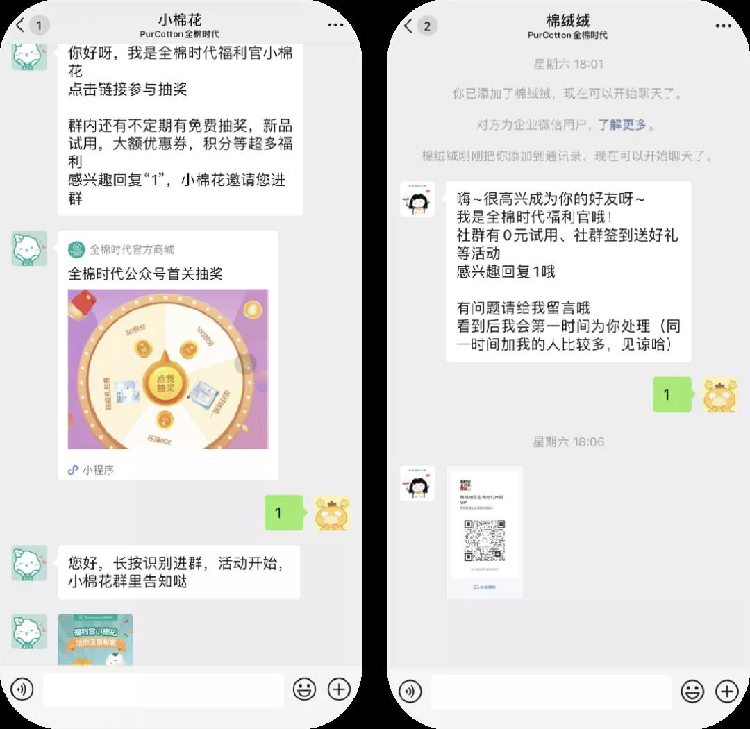 扫码后添加到官方客服的企业微信。全棉时代基于企业微信,围绕品牌和产品的特性,打造了两个统一的企业微信客服形象:小棉花和棉绒绒。