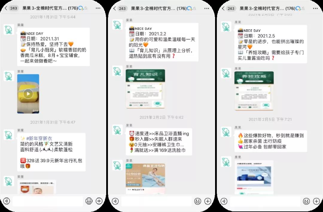 全棉时代社群内不定期进行产品介绍和分享、活动预告、直播链接分享等品牌官方信息。简单的文案+相关下单小程序码或者链接,能够将品牌活动及时触达给用户,引导社群用户下单,促进转化成交。