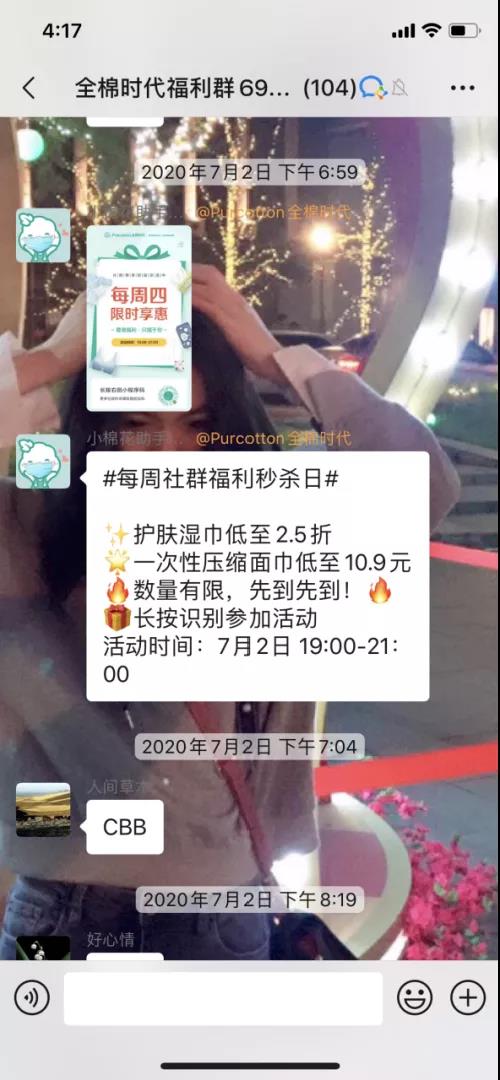 全棉时代固定每周发起一场社群专属秒杀活动,固定每周四开启秒杀,以特惠活动的形式刺激用户下单,同时群内用户对这类固定活动形成习惯,更深刻感受到社群的价值。