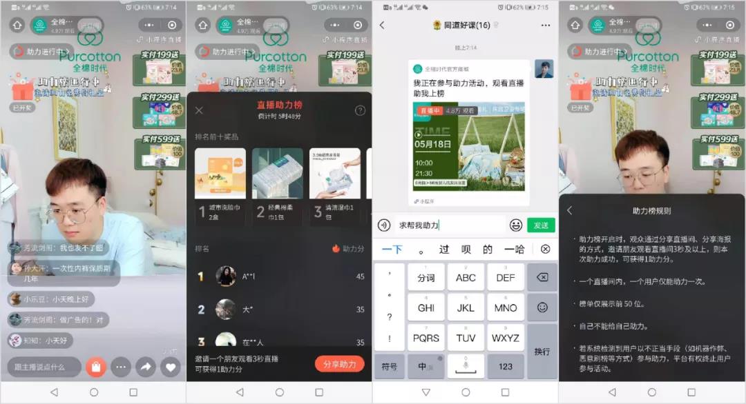 通过助力榜的社交裂变,小程序直播过程中也源源不断地提升流量。 除了直播间的社交裂变,全棉时代小程序还通过养成类、助力类的社交裂变活动给商城持续拉来新的客户流量。