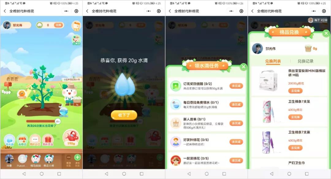 客户每日登录游戏,完成任务就可以获得水滴,这些水滴就像是社交货币,用水滴可以给棉花浇水,游戏中的棉花便随之成长,最后到达某个阶段便可获得不同的奖励。