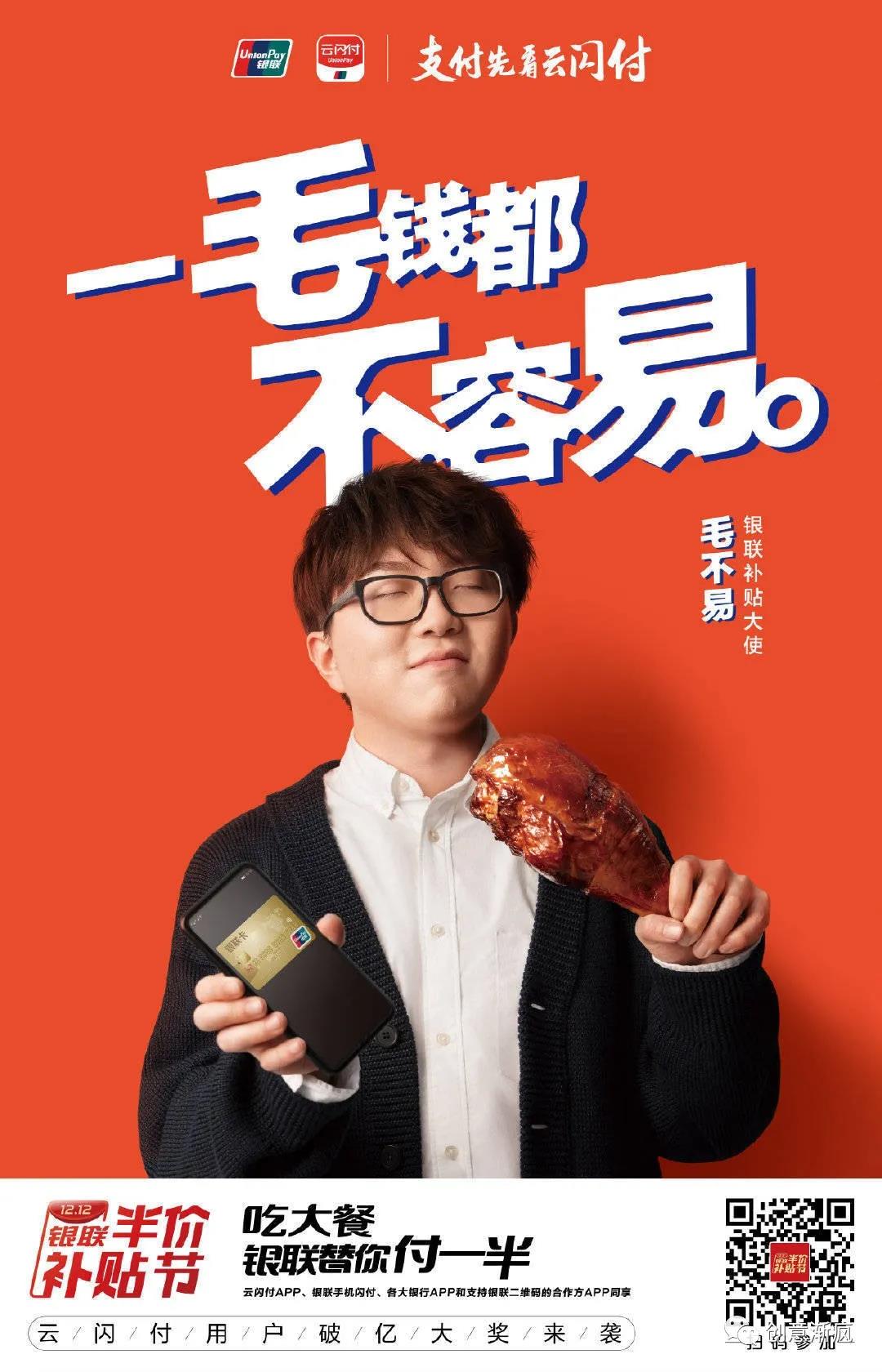 在博得读者会心一笑的同时又让他们感到一丝困惑,想要继续看下去,这时候,"银联替你付一半"就给出了答案,直接描述了利益所在,超大的补贴力度,吸引你来参加。