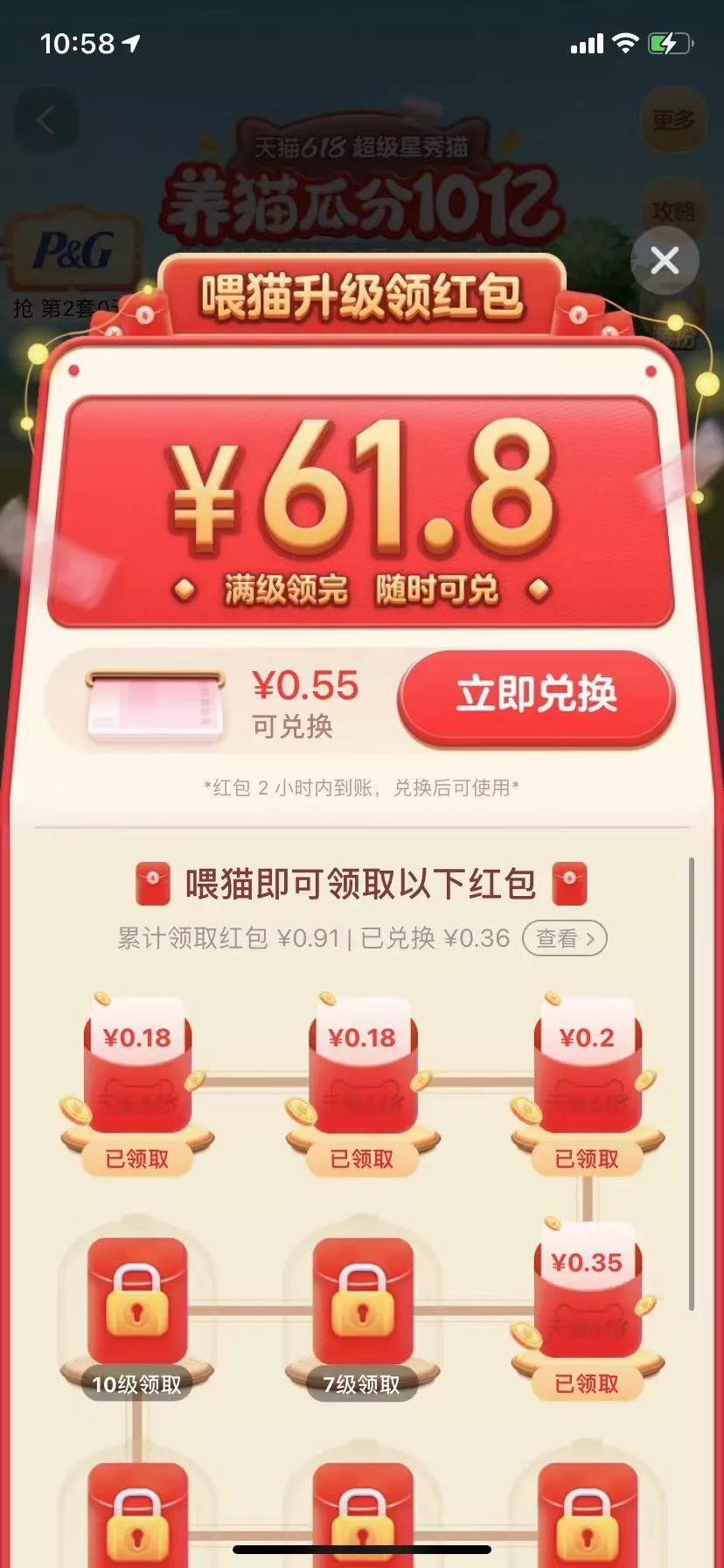 本次活动利益点是"瓜分10亿",且只要把猫养到50级即可获得61.8元,通过具体的金钱利益驱动用户,满足用户偏好确定性的心理。