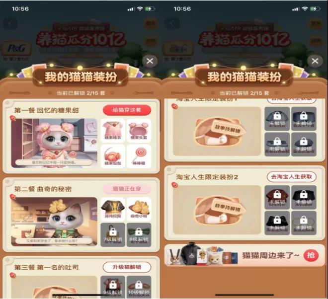②设置了不同等级装扮道具,最后引流到猫猫周边,吸引精准客群实现IP变现。