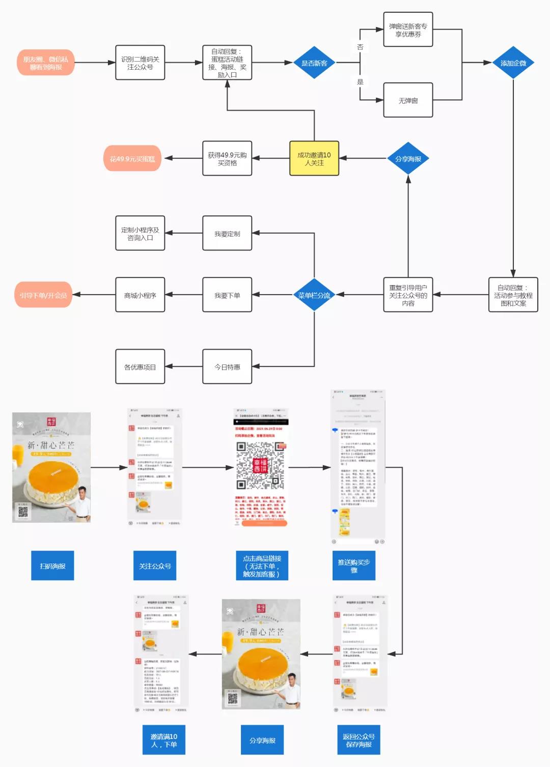 1)从活动设置上看,没有在关注回复中放置参与步骤,而是放置限售蛋糕的详情链接但不能直接购买,而是在页面中增加了客服企微,触发想购买的用户添加企微,增加了用户的参与成本(路径变长),行为成本较高。