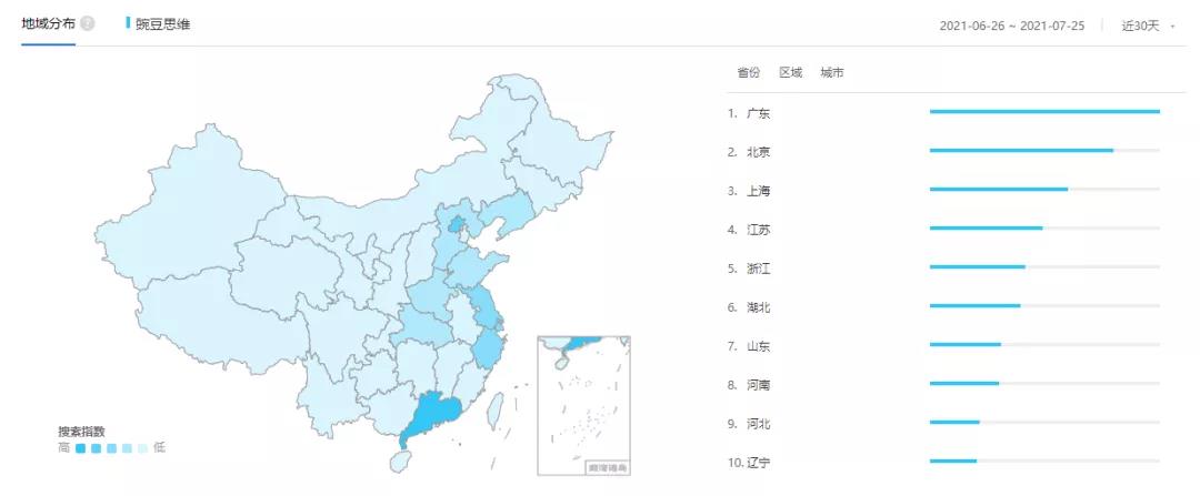 广东用户占比最多(考虑到豌豆思维最开始在广东注册发展)