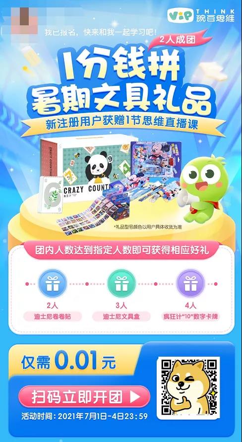 案例名称:【豌豆思维】1分钱拼暑期文具礼品