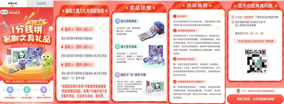 本次活动,1分钱拼团即可获得精美的文具礼品,而且新用户在领取拼团奖品的同时,还可以获赠1节思维直播课,几乎没有什么成本,若不参加就会有一种损失感。
