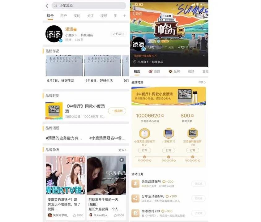比如在八月刷屏的添添(智能音箱小度旗下的科技潮品,包括旋转智能屏、词典笔等),邀请用户参加"品牌时刻"活动,承接微博的公域流量,转化社交资产,激活新老粉丝,沉淀更丰富多元的内容,增强互动。