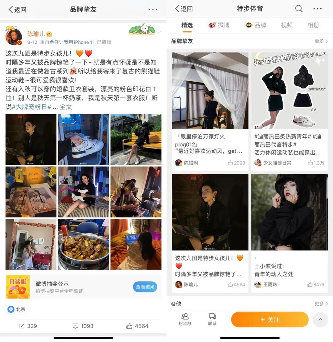 譬如,紧接着奥运后的热潮,特步开展社交营销。KOL(关键意见领袖)分享自己的特步穿搭体验,如下图,微博品牌号的"品牌挚友"板块,聚合了时尚大V@陈错啊 、种草达人@陈瑜儿 等等,让流量互相碰撞,产生更广泛和更长期的影响力。