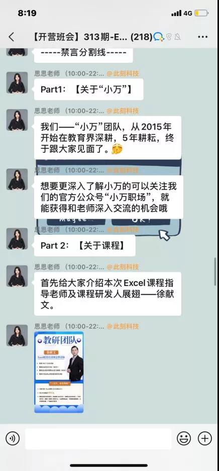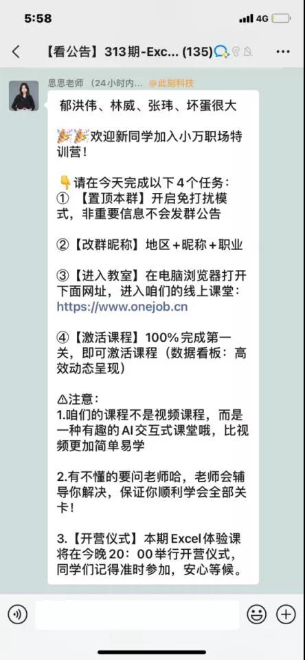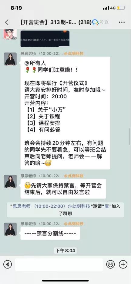 用户入群,会收到欢迎语,直接告诉用户上课方式及开营仪式,打造仪式感,仪式感可 以让用户有强烈的归属感及期待感,增加信任,提升课程效果。