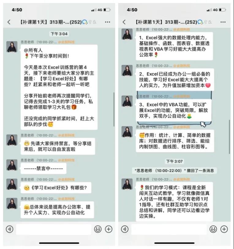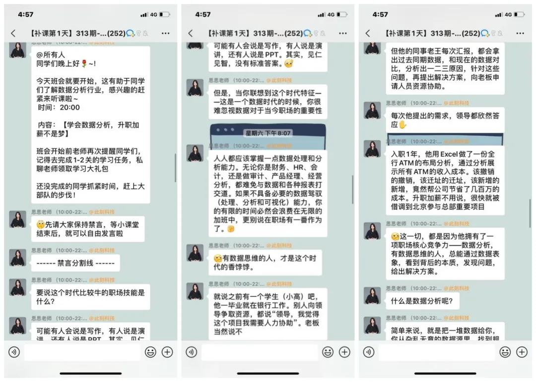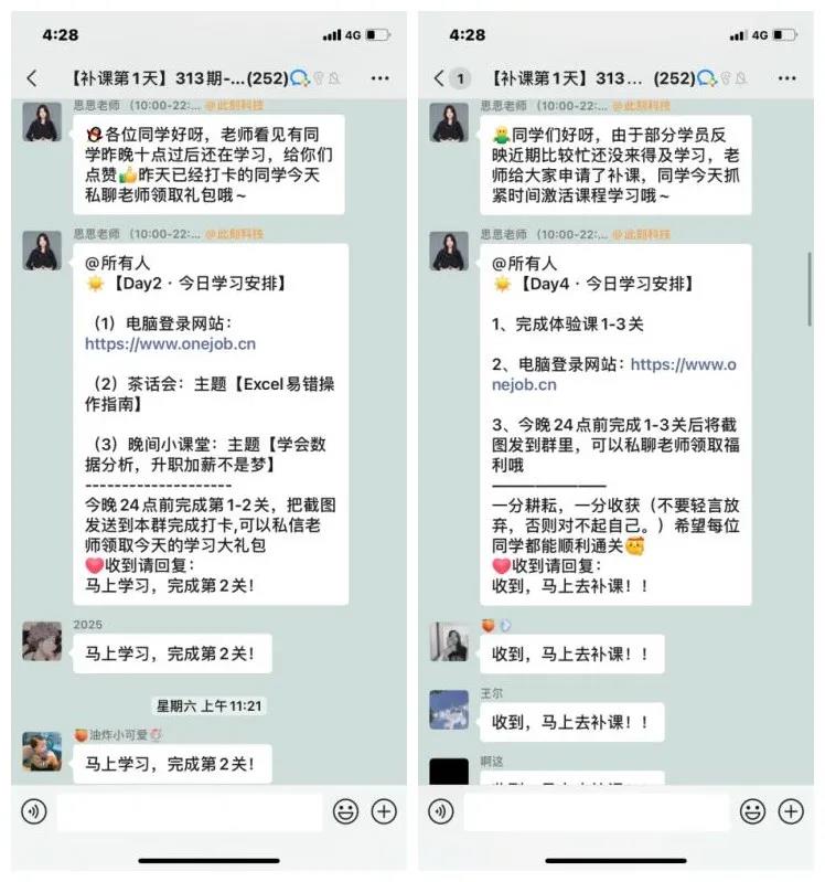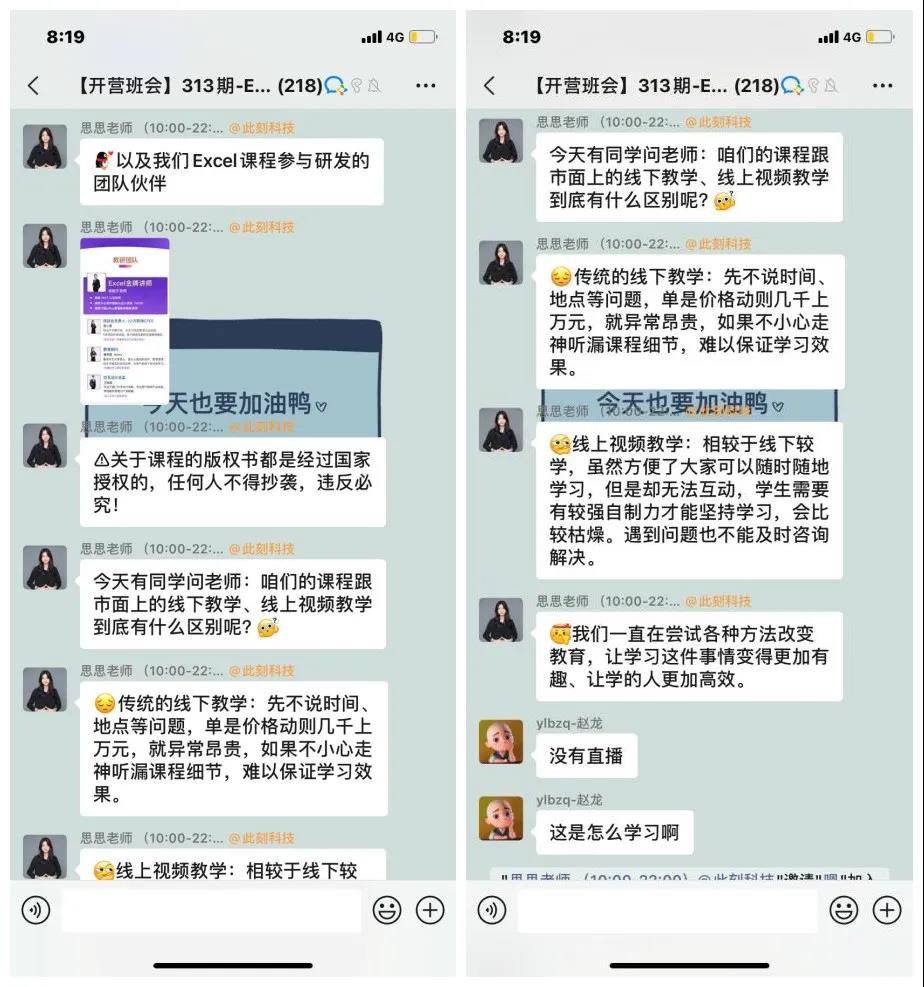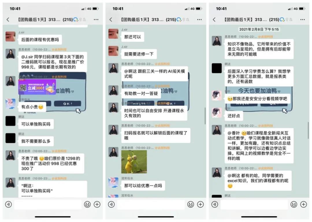会有用户互动,询问课程内容及课程优惠,引起其他用户的兴趣,促进社群活跃,群主 再次推出后续正价课程介绍及优惠信息,更容易吸引用户注意,从而促进购买更高客单 价课程。