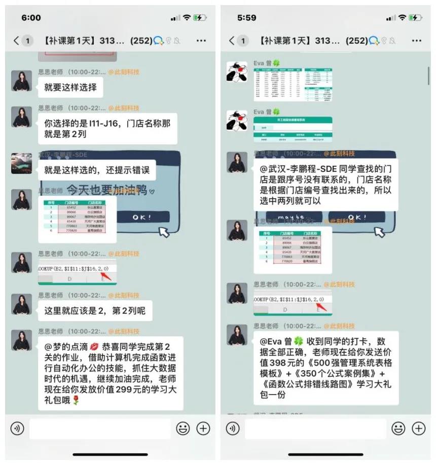 在单聊场景中根据课程进度设计了相应的动作,保证相关活动的触达效果.,提醒完成作业打卡可领取学习大礼包,每天会群发一次消息,通过单聊群发,可以更快的触达到用 户,通过活动优惠,激活一些平时不太活跃的用户,实现转化。