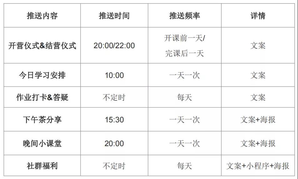 开课前一天晚上 8 点,做一个整体的介绍,建立社群的仪式感和参与感,增加用户的信任。