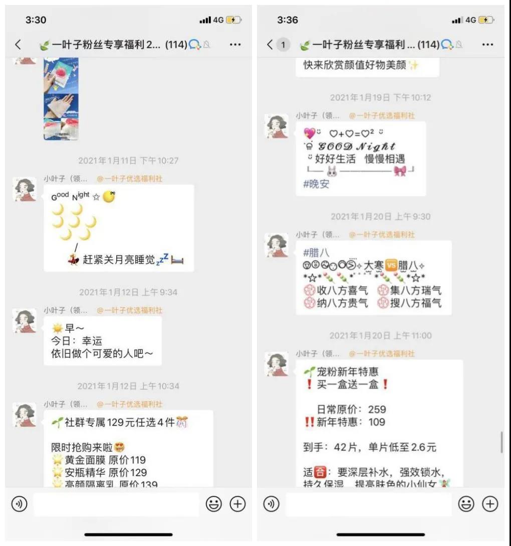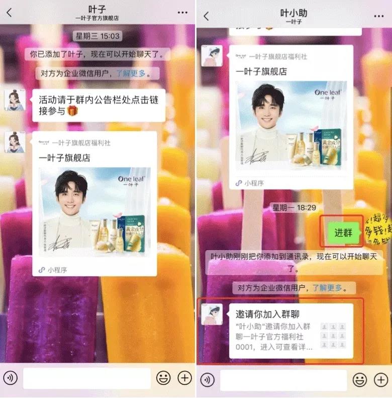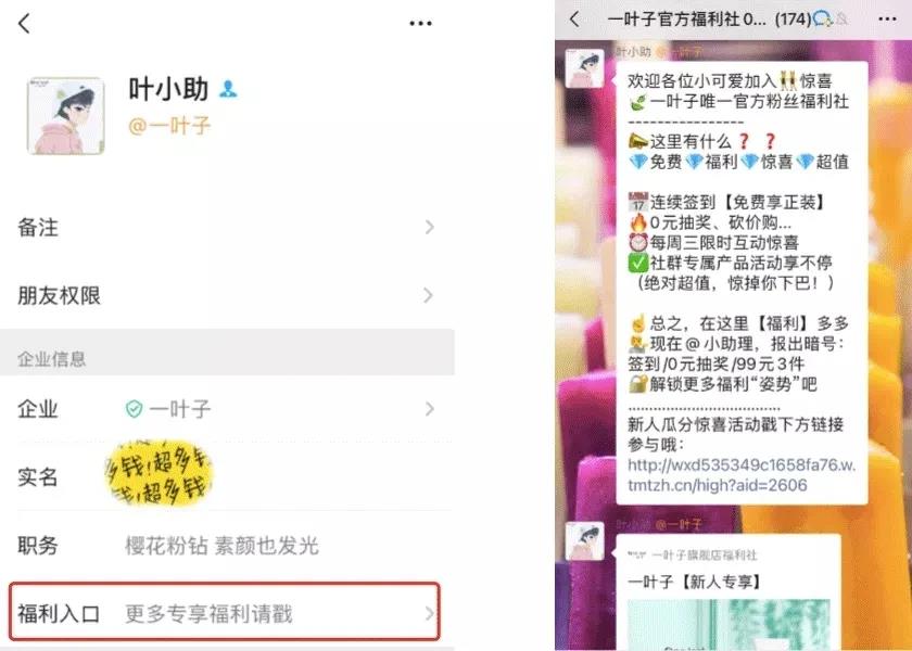 企业微信号,品牌宣传和种草号的角色,日常定时在社群内推送各种活动消息。叶子这个角色配置了统一的女生卡通形象照,同时企微号主要添加了种草内容的入口——叶子说,这个后面会说到。