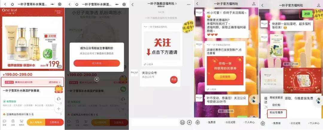 依靠线上渠道逆势增长107%的一叶子,除了发力官方小程序,更是开通微商城服务,上线了一叶子官方福利社,从而加持对微信流量的挖掘。