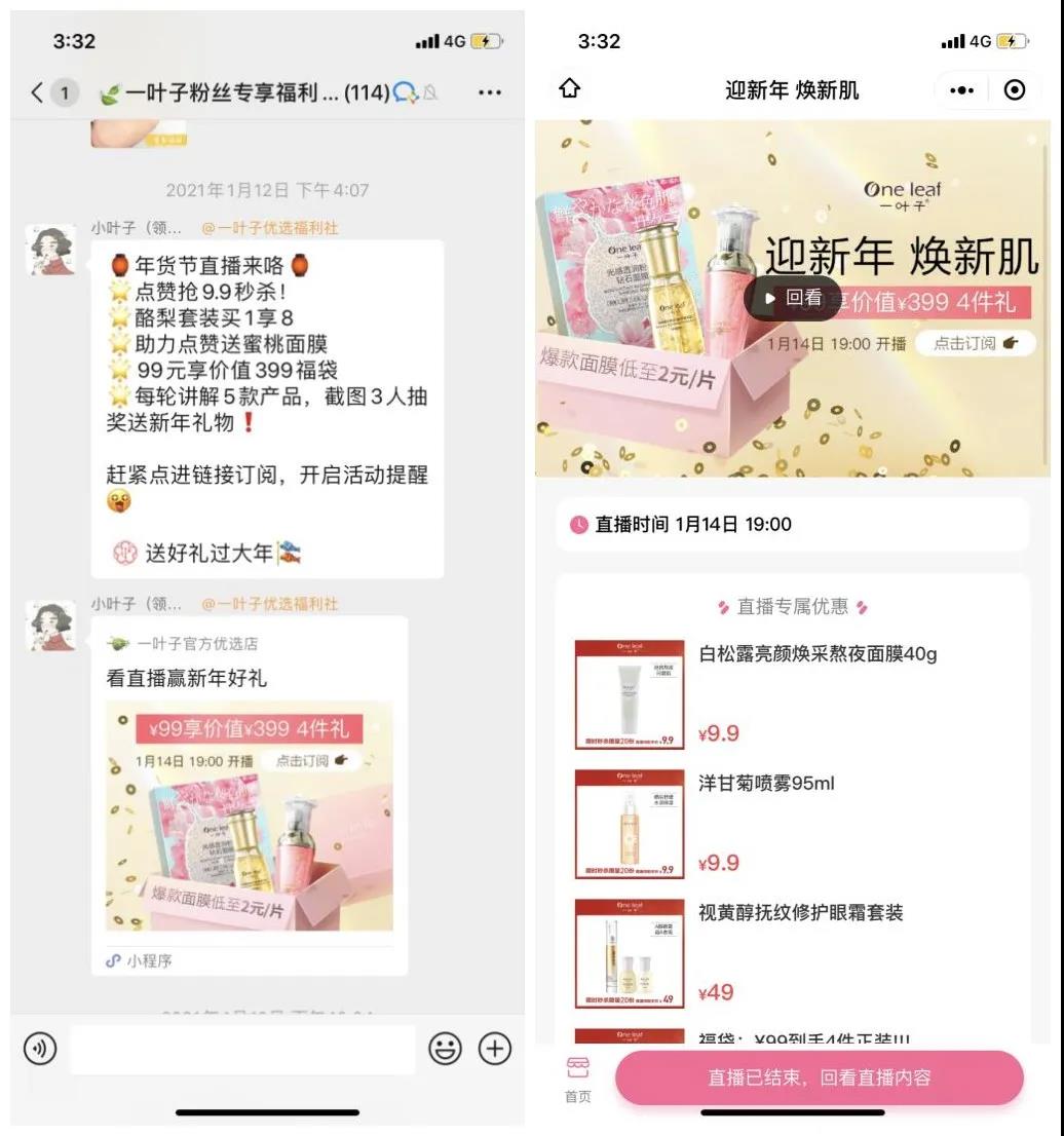 宣传形式:文字+小程序,文字中会说明本次直播的活动福利,同时引导客户进行提前订阅,以防错过活动。同时在直播活动的前三天就开始在群内宣传预热。同时在直播过程中,还会在群内及时同步直播间的产品及福利活动,促进客户参与