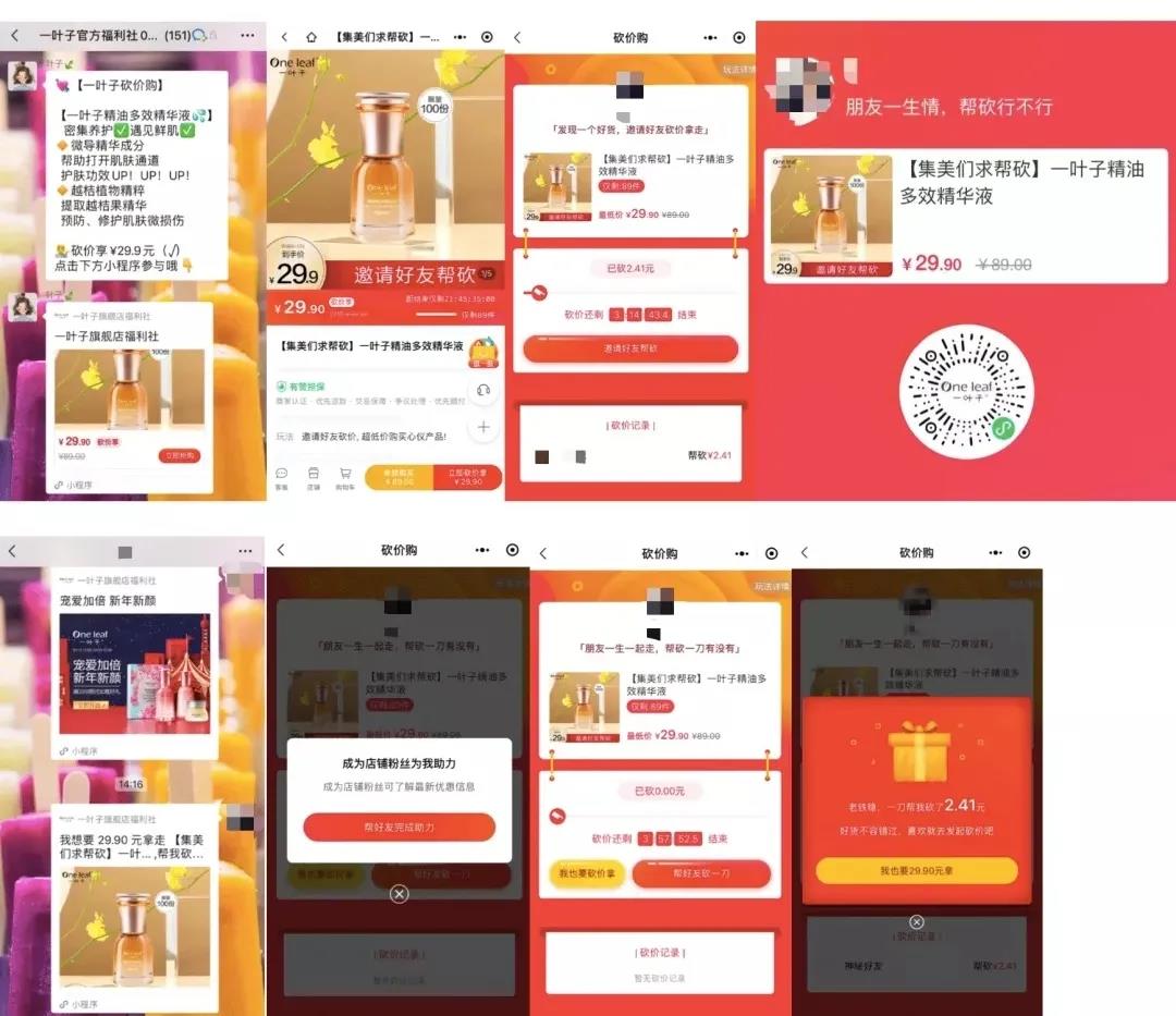 一叶子利用"砍价购"活动,通过社群用户的传播分享,邀请好友助力,即可以低价获得商品。同时帮忙砍价的好友也可以发起砍价,邀请更多好友助力,从而实现粉丝裂变增长。