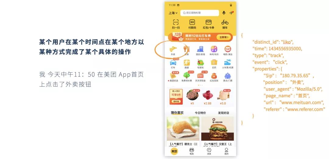 比如说今天中午 11: 50 的时候,在这个美团的首页进行了一个外卖按钮的点击。那这个时候话美团公司它会记录到我中午十五十一点五十分在这个美团 APP 的首页,点击了这个外卖的按钮,然后会传一条信息包含类似截图右侧的格式数据就会发送给这个美团的服务器。