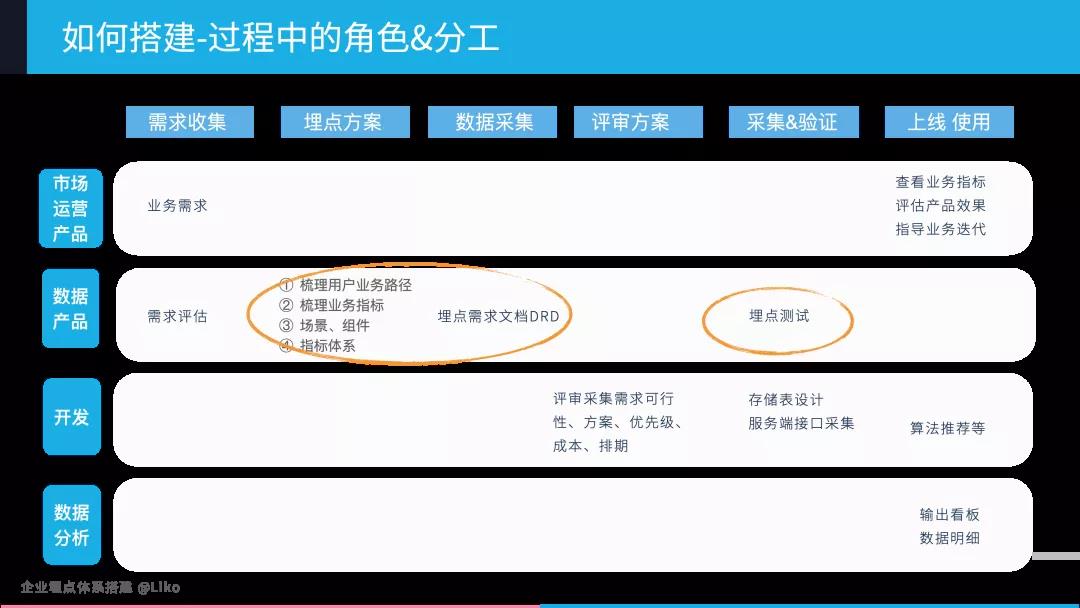在埋点采集到应用过程中涉及到各个不同角色相互配合,会有各自的分工。