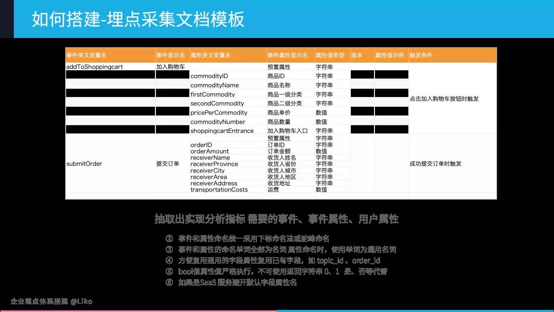 上面这个是一个比较典型的埋点需求文档样例,包含事件名、属性信息、触发时机、示例等等基础的埋点信息,在实际设计埋点需求文档时需要考虑命名的规范、属性信息的复用等等。