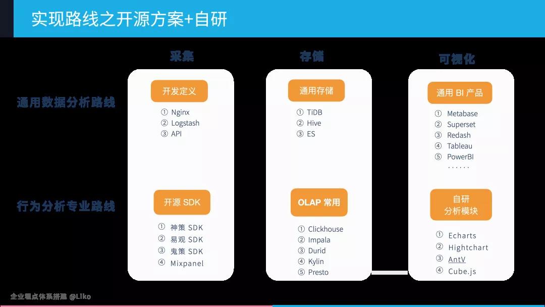 通过这几个部分了解到在一个中大型的公司里面去完成一个数据平台,以数据采集体系平台的搭建这个完整流程,在一个小公司中借用一些开源的工具以及第三方的 SaaS 的服务,能够进行一个简单的行为分析平台的搭建。