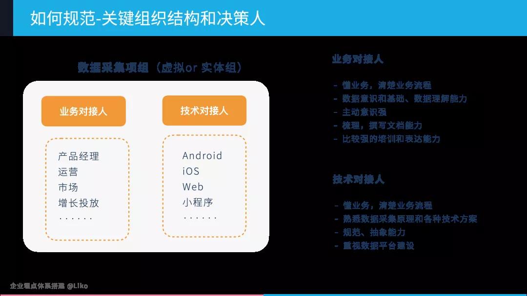针对如何规范埋点业务,我们也是从组织和工具两方面进行,组织层面上我们划分为业务相关和技术相关,各自都需要一个关键对接人。