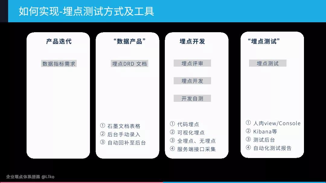 埋点测试是在开发完了以后需要在测试工具上去做数据的验证。最原始的就是去做人肉的view, 就是我们拿一个小板凳蹲到开发工位旁边去看一下这个代码,它触发你看数据,这个对不对?这个是最原始的。另外有Kibana 之类的查询工具可以协助快速的做埋点日志的查询提供简单的可视化展示。另外也可以尝试做自动化测试,自动 mock 数据生成测试报告,版本回归测试效率都极高。