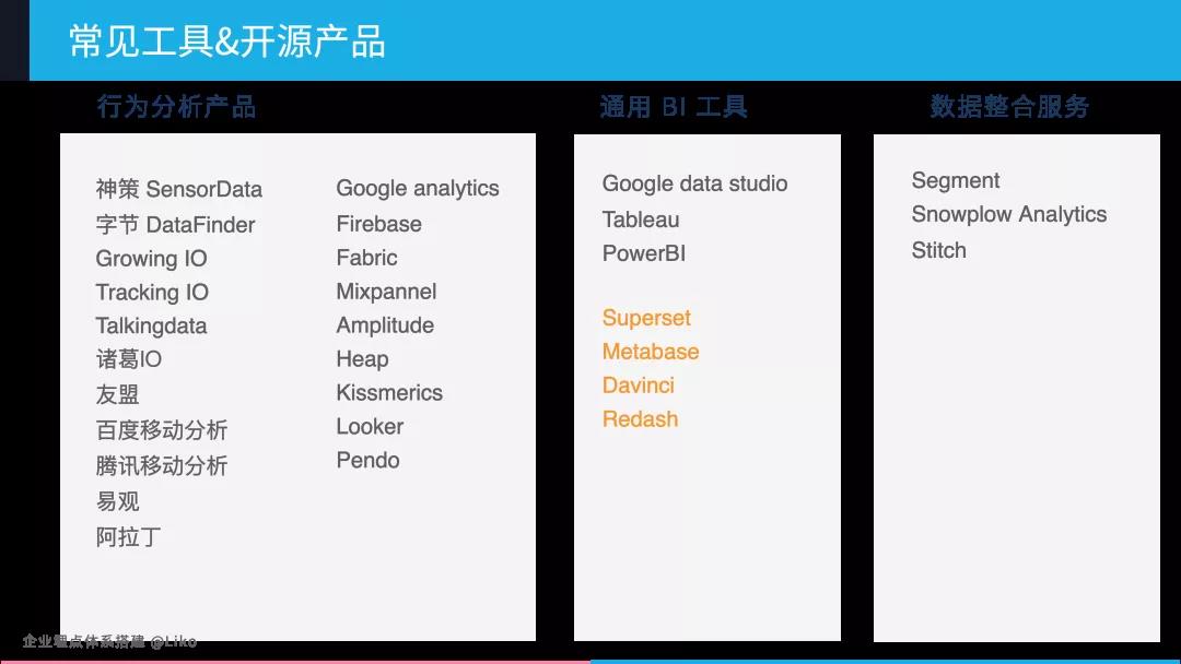 这类产品在数据平台搭建的时候也是非常重要,通常我们在初期会将行为数据和 BI 工具合并在一起进行业务支持,到后期后会拆分出来成为两条不同的业务产品线。