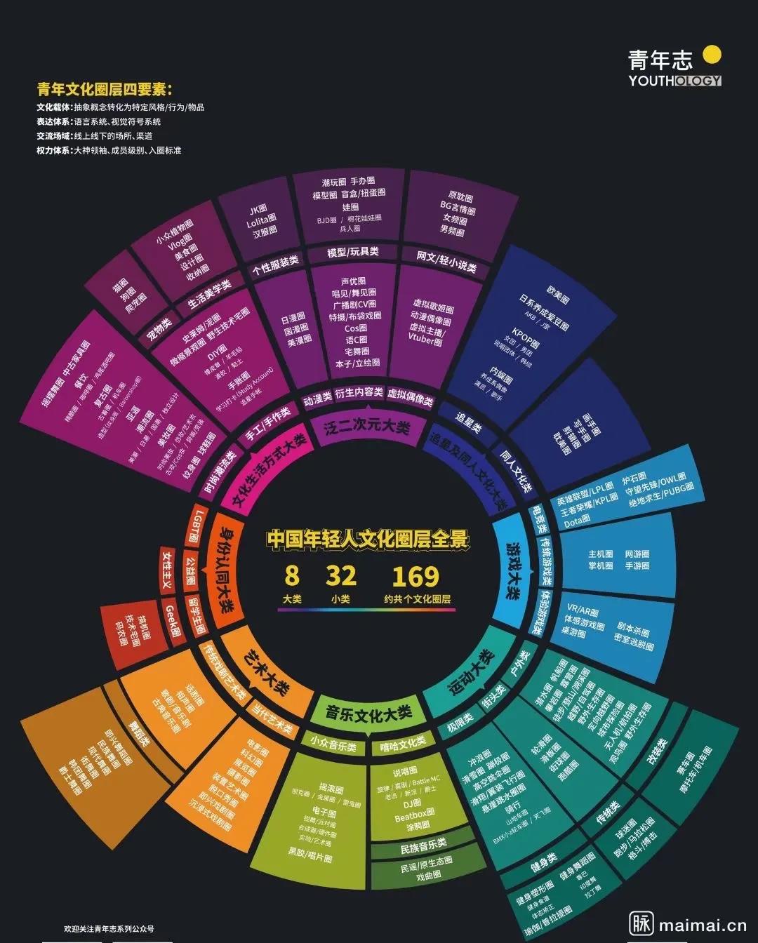 躺平是一个很有趣的词,他暗含着年轻人精神的空虚、价值方向的缺失…在躺平的影响下,诞生的不同兴趣圈层可能是年轻人避世的乌托邦。数据显示,中国年轻人文化圈层分为8大类,32小类,总计约169个文化圈层。