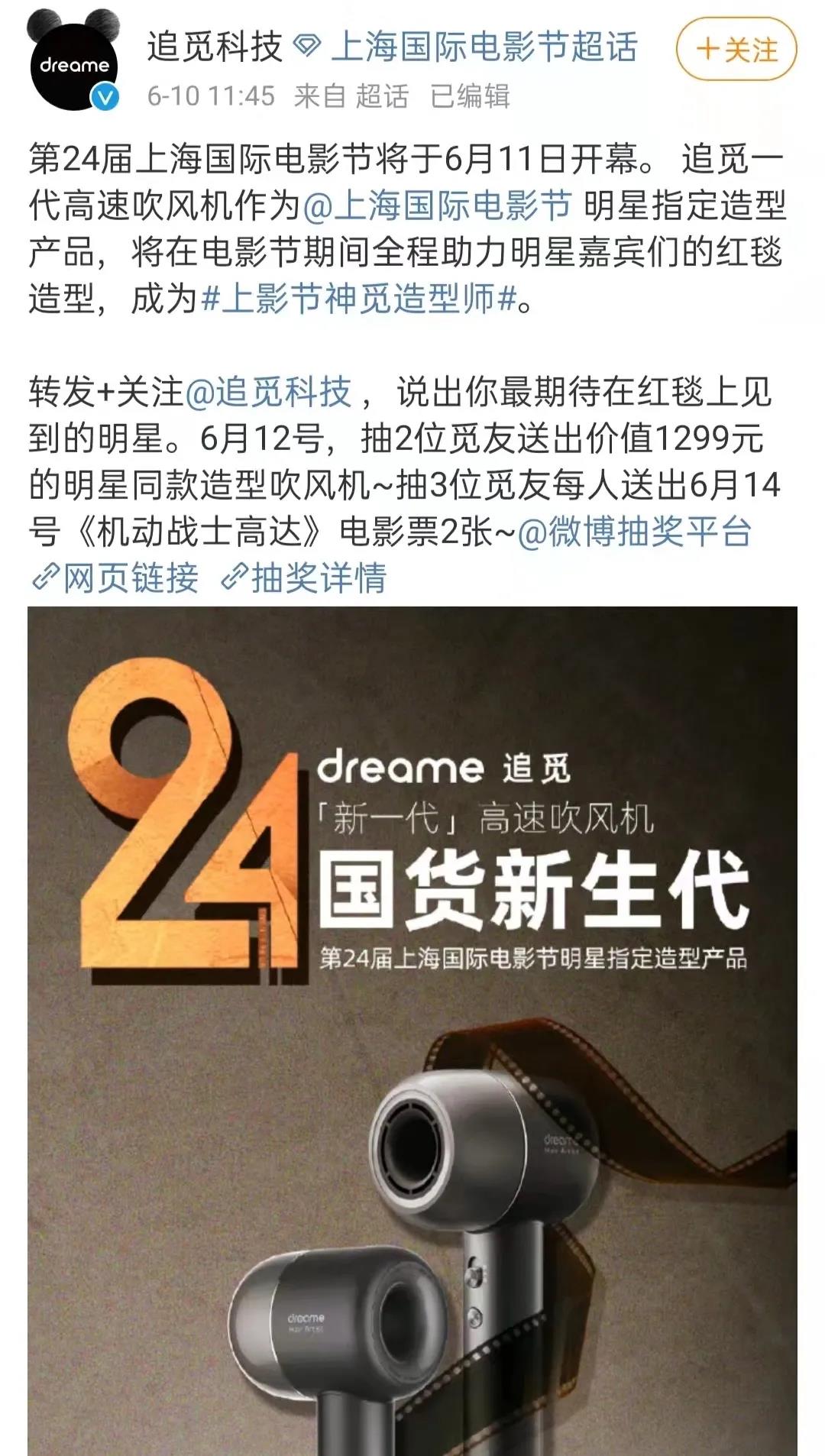 通过一次两次的品牌曝光是不足以解决问题的,还需要将影响力打广、打深。追觅趁热发力,于6月10日在微博发起上海国际电影节开幕的抽奖活动,通过电影节的热度以及追觅作为明星指定造型产品的吸引力,引起了电影、时尚等圈层人群的关注。追觅与#上影节神秘造型师#、#上海国际电影节#话题的热度捆绑,让话题阵地也更为活跃,更是吸引了不少新用户的参与。