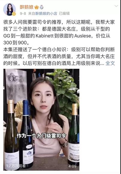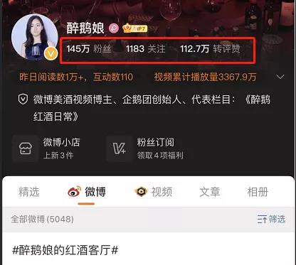 醉鹅娘最初从微博发力,将人设定为一个懂酒的年轻人,用年轻人能听懂的通俗语言,分享红酒知识。比如从葡萄酒的香气、味道和口感等特质切入,甚至把酒比喻成不同类型人物、电影、书籍,亦或一些大众娱乐产物。