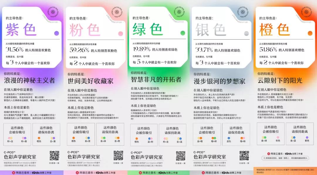 如在今年风靡网络的网易云音乐基于《找到你的颜色,发现你的性格》的性格测试,让颜色代表用户的性格,在各类测试中让用户去发现自我、了解自我的性格偏向。内容通过轻松、幽默的方式阐述了颜色代表性格的倾向性,好奇心驱使用户参与到网易云音乐设定的H5中,引发了朋友圈短暂的社交狂欢,也让网易云音乐的营销成功脱颖而出。