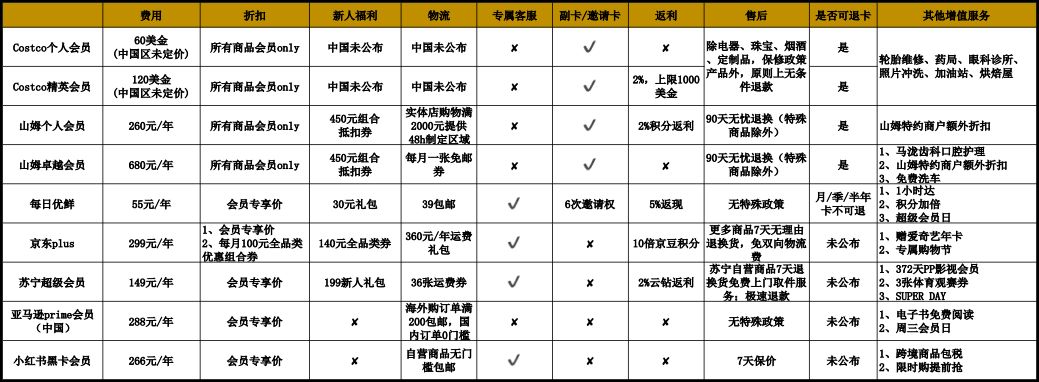 于此同时,京东、苏宁、亚马逊、每日优鲜、小红书等各大综合/垂直电商平台纷纷开始大力推广付费会员制服务。