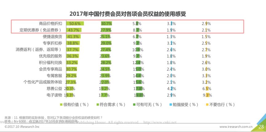从艾瑞咨询的调研报告可知,在17年中国付费会员经常使用的各项权益中,价格折扣和免运费券为使用最多的权益,用户认同度分别为50.6% 和43.7%。