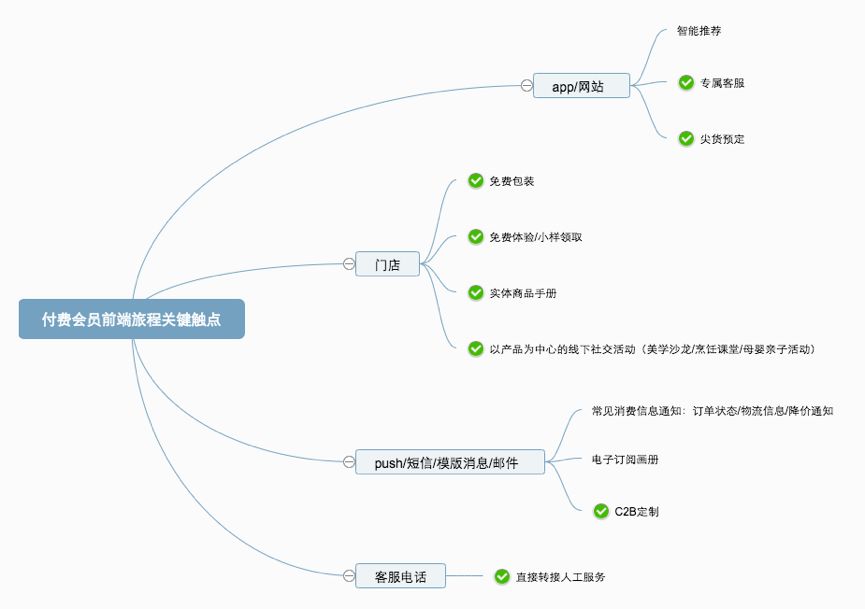 以新零售常见场景举例,下图中✔️部分为付费会员触点中带来惊喜的体验,可以看出,除了少部分商品/营销成本外,大部分惊喜体验需要通过增加人力成本来实现。