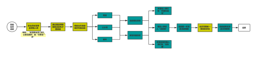 下图是基于线下会员活动场景的自动化营销流程,绿色部分均可通过系统配置实现,黄色部分可由人工借助系统快速实现。