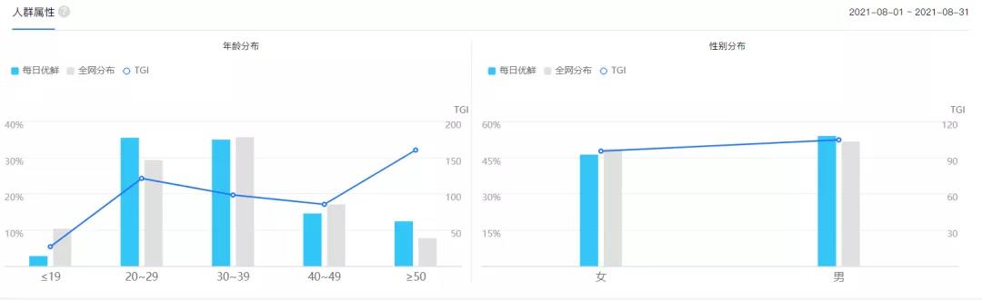 每日优鲜用户的年龄在20~39岁之间,都是80、90后,其中00后用户占比最少,这和用户需求度有很大相关性。每日优鲜的性别比列趋近1:1 。