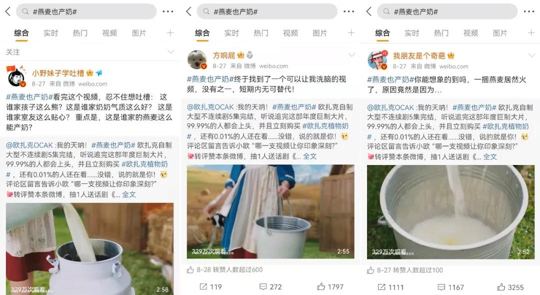为此,欧扎克植物奶发起#燕麦也产奶#的互动话题,发动微博、抖音、小红书、公众号等平台的头部KOL,各大kol结合自身调性从乳糖不耐受痛点、沙雕广告等角度下场点评。欧扎克植物奶借助kol发声,打破圈层边界展开全方位的种草,扩大植物奶在各大平台的影响力,更好地圈粉年轻妈妈、白领等不同圈层。对于品牌来说,通过口碑传播真正将创意的笑点转化为产品卖点的认同。