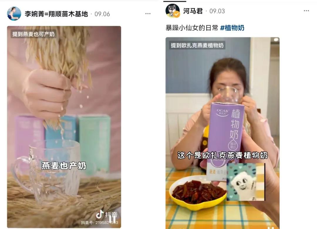 一是重复洗脑策略。每个视频都重复出现同一个动作符号——用燕麦挤奶,以及魔性的slogan"我的天哪,燕麦也产奶""除了牛奶还有欧扎克植物奶",仔细琢磨这两句文案同样大有深意。