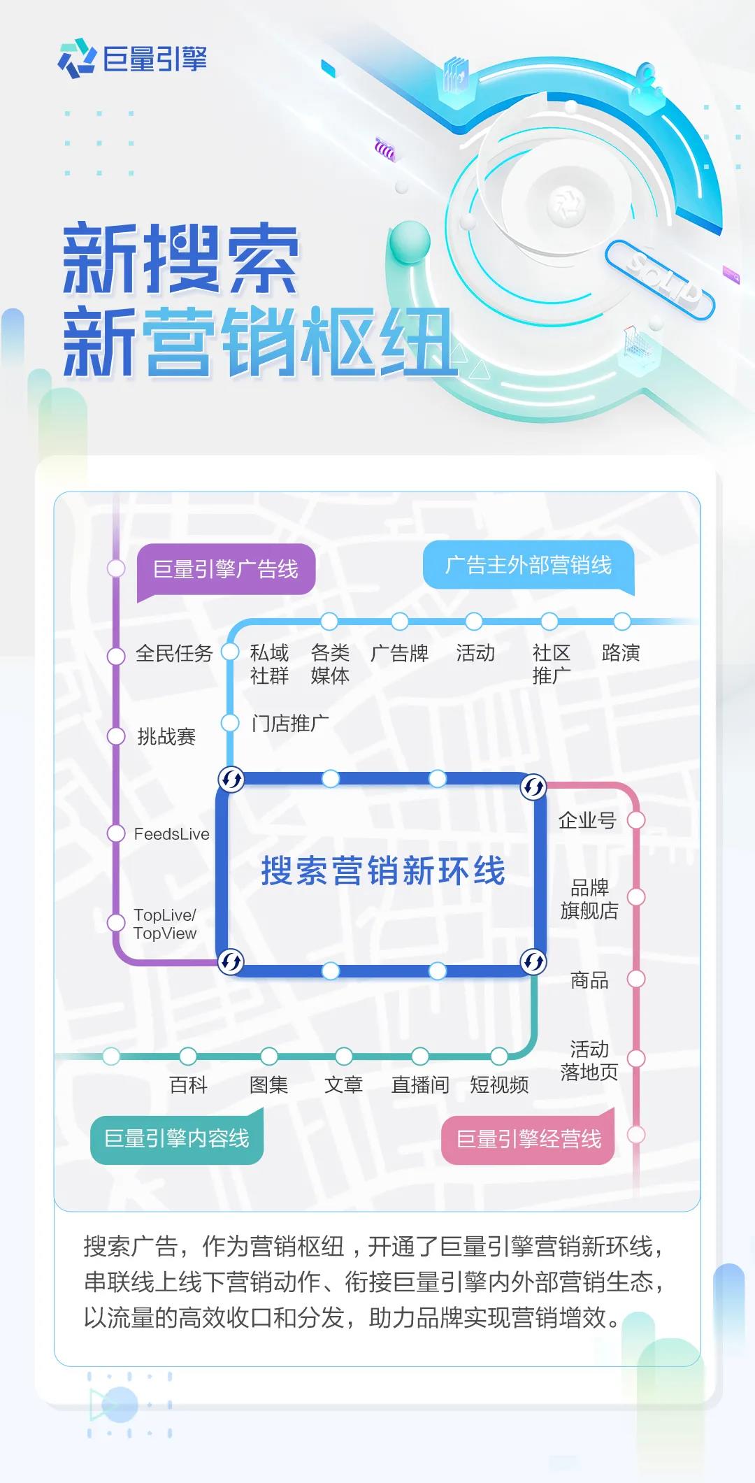 对于品牌来说新搜索成为了整合营销全链路中的营销枢纽角色,它连接了广告主和巨量引擎生态内的各种营销产品,是衔接曝光流量收口到流量再次分发的营销枢纽。