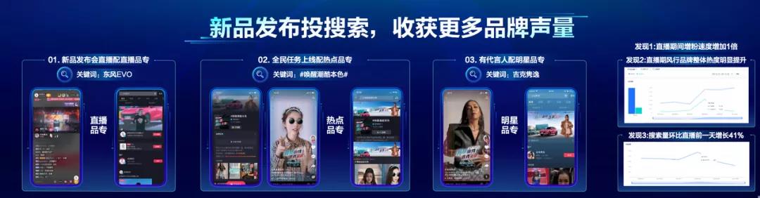 例如,从抖音的开屏、直播、短视频,到话题、评论区、挑战赛等等,都有可能激发用户的兴趣,这时巨量引擎新搜索作为一个营销枢纽,能够很好地收口曝光带来的自然流量,并进行流量的再次分发,让用户碎片化的需求价值,随时可以被承接。