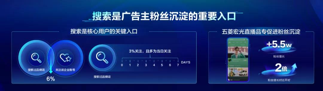 没有具体的案例就没有具象的感知,以五菱宏光为例,搜索展示协同各类优质内容曝光,引来了大量用户,在直播中直接沉淀了5.5万的粉丝,增长是平时的2倍,为五菱宏光后续私域运营积累下了一笔巨大的品牌资产。